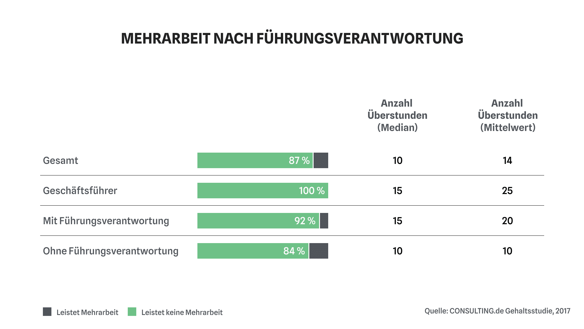 2. Überstunden kommen in der Branche häufig in hohem Ausmaß vor, werden aber nur selten bezahlt. Von der 40-Stunden-Woche träumen die meisten Berater:innen. Zehn Überstunden pro Woche sind durchschnittlicher Standard und eine 60- bis manchmal sogar 90-Stunden-Woche nicht selten. Auf die Anzahl der Stunden gerechnet, sieht das Gehalt dann gar nicht mehr so spektakulär aus.