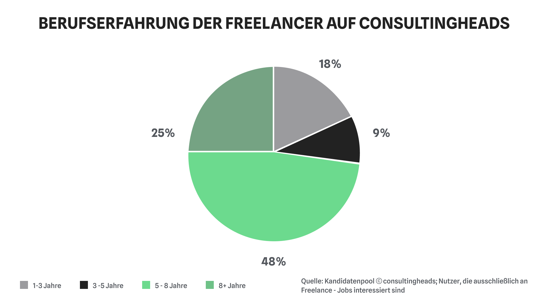 The Institute for Research on Small and Medium-Sized Businesses estimates the number of consultants currently working on a freelance basis in Germany at over 50,000. The information provided by our users confirms the interest in freelancing among consultants: 60% of consultingheads users are interested in a freelance position, 31% are exclusively interested in it