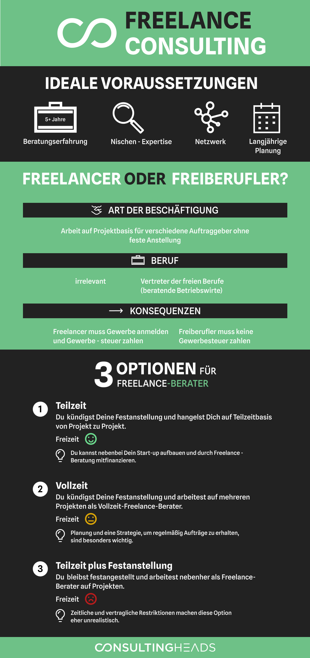 If you are a consultant and are thinking about starting your own business as a freelance consultant, then you are like many other consultingheads users. The desire for flexibility and self-determination with regard to projects and working hours is often at the forefront. Self-employed consultants can expect comparable compensation to their salaried colleagues, but benefit from greater freedom and a better work-life balance